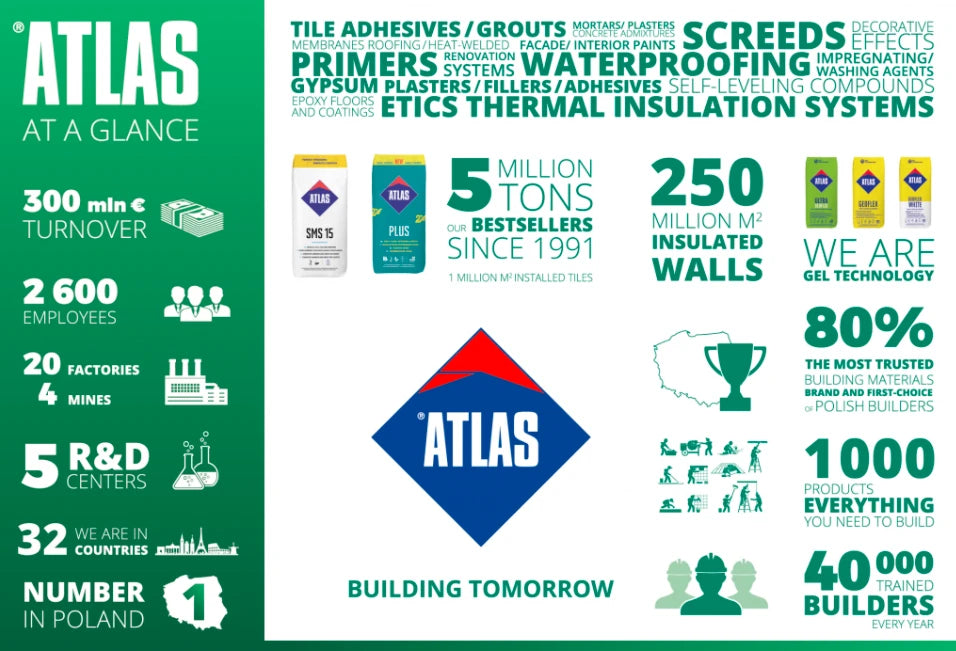 ATLAS Group is a Polish manufacturer of construction chemicals supplying the international market, They are a leading in Central and Eastern Europe. The Group history dates back to 1991, when three residents of Łódź, set up a company producing an adhesive for tiles. Within a few years it became an undisputed leader in the European market.